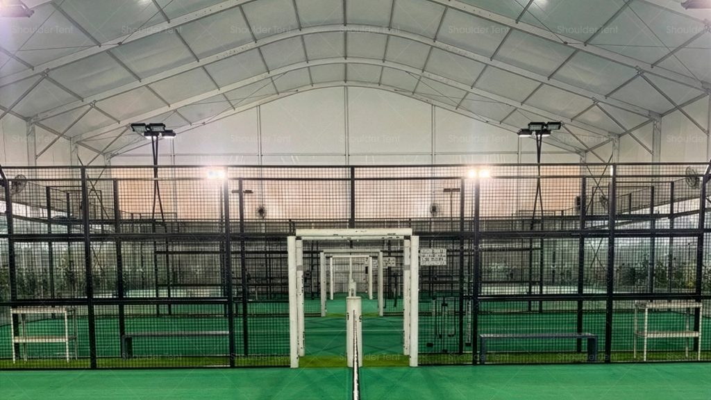 Interior view of a professional tennis tent featuring blockout PVC fabric to reduce heat, covering a blue hard court manufactured by Shoulder for all-weather play.